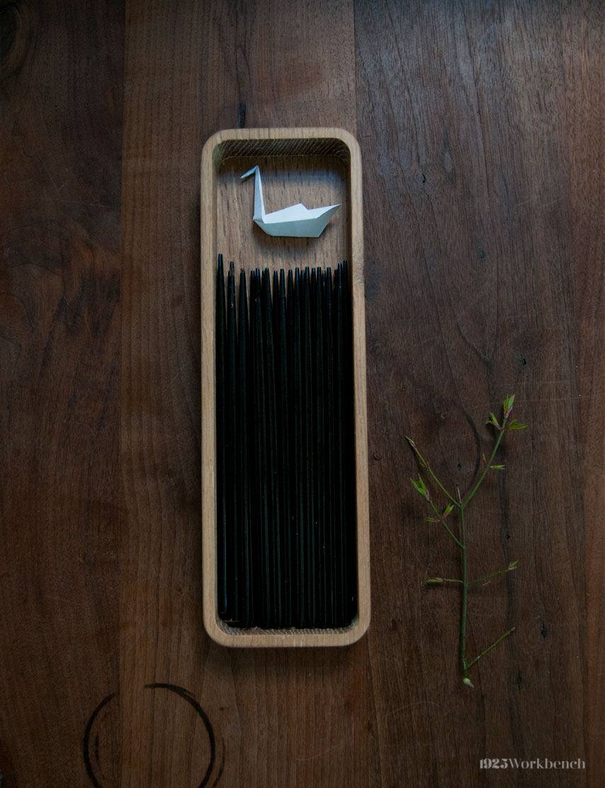 Made of white oak or walnut, finished with a durable oil finish. We like the elongated shape and thought it is perfect for chopsticks. But it’s just as perfect for a catch all, keys, jewelry, candy and stationery. We love the curved corners inspired by our Curvy Corner door.