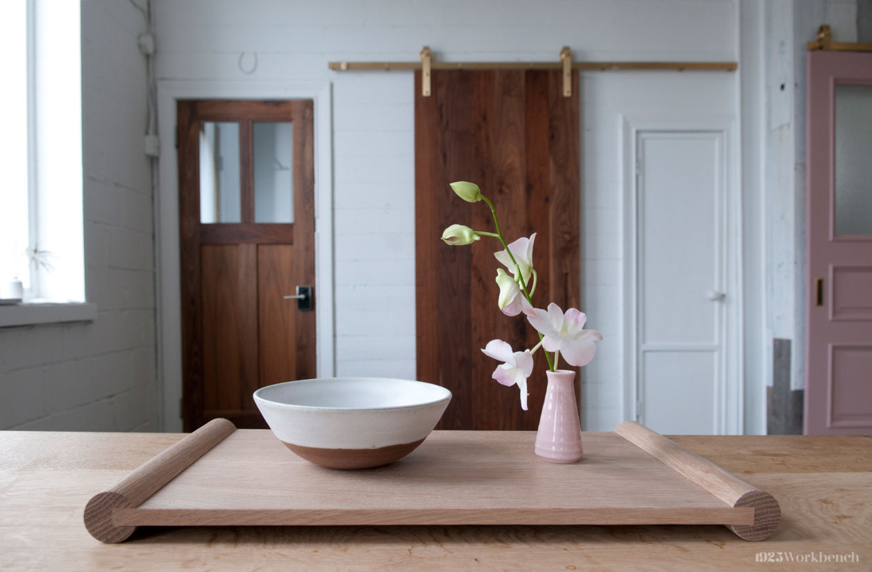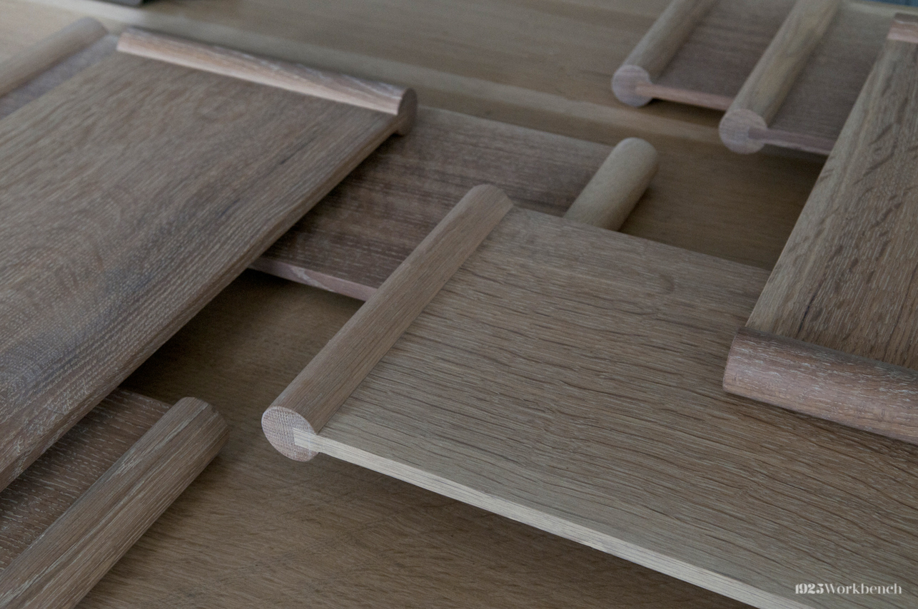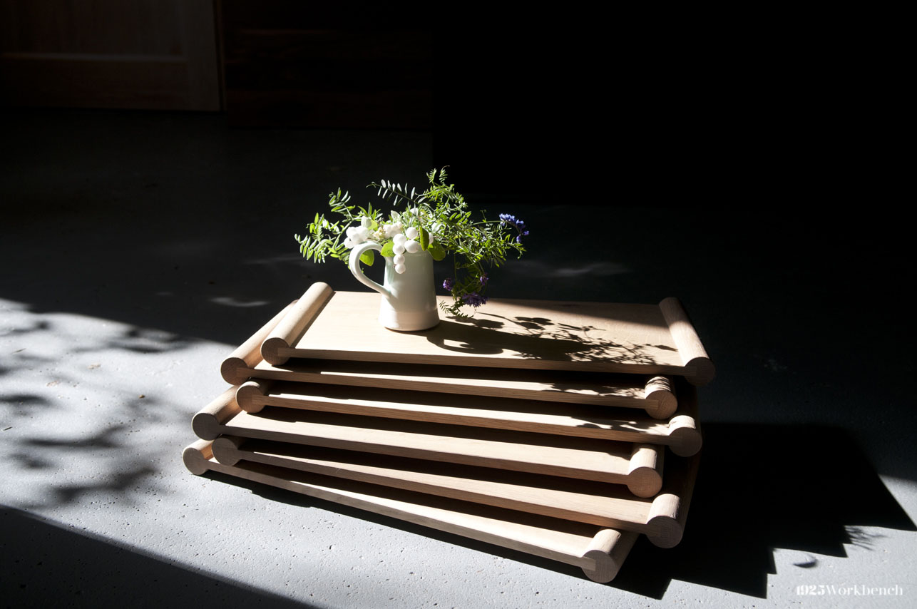 Made of white oak and finished with a durable oil finish. Inspired by our Piping table and bench, we created this as a gift for a friend, but is now a small product we offer. You can use it as a tea tray, pastry tray, or even for displaying jewelry. They can be stacked to create playful arrangements.